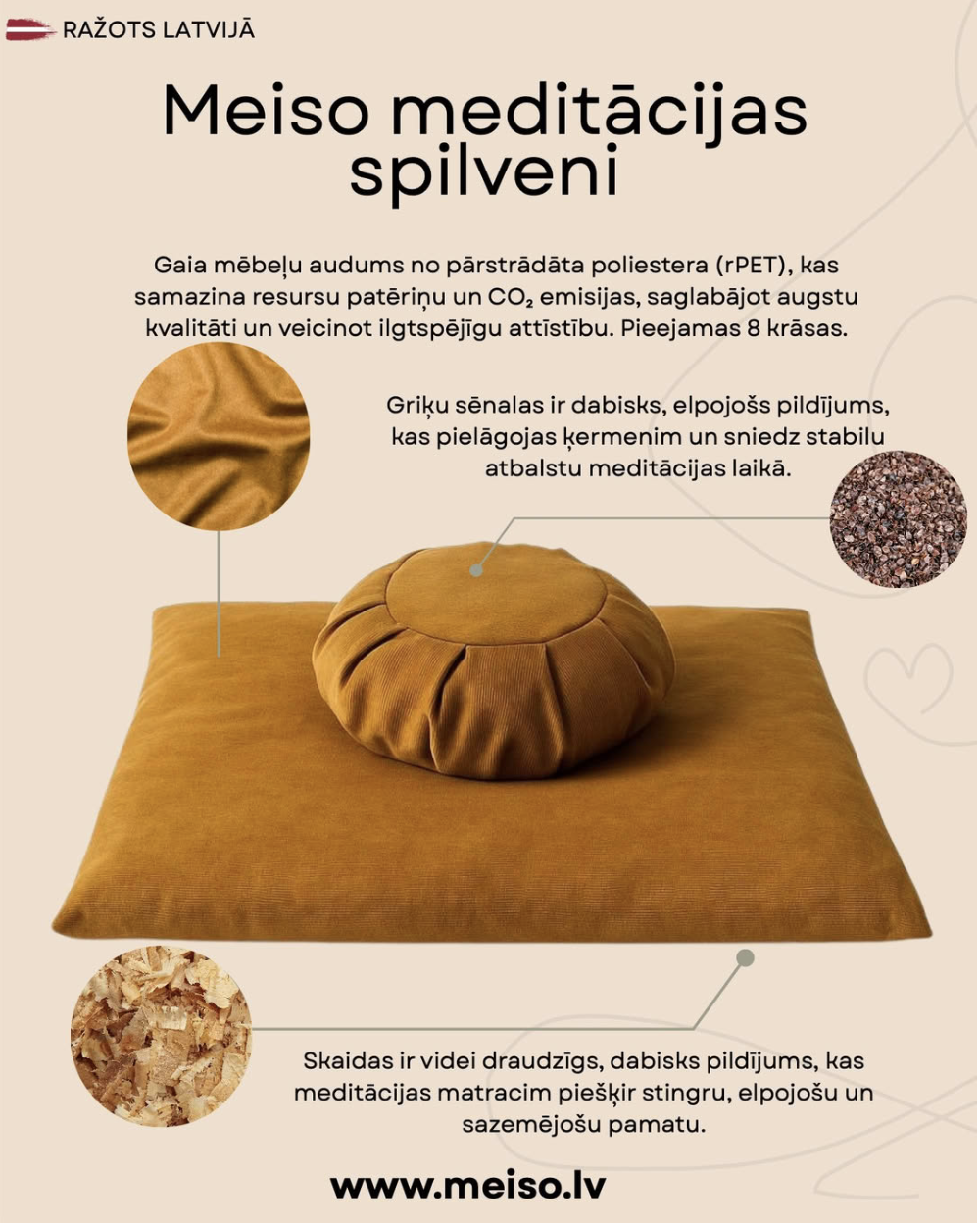 Meiso meditācijas spilveni un matrači ir paredzēti ērtai un stabilai meditācijai, vienlaikus rūpējoties par planētu. Katrs meditācijas spilvens un matracis ir rūpīgi izstrādāts, izmantojot otrreizēji pārstrādātu audumu un pildīts ar dabīgu materiālu.